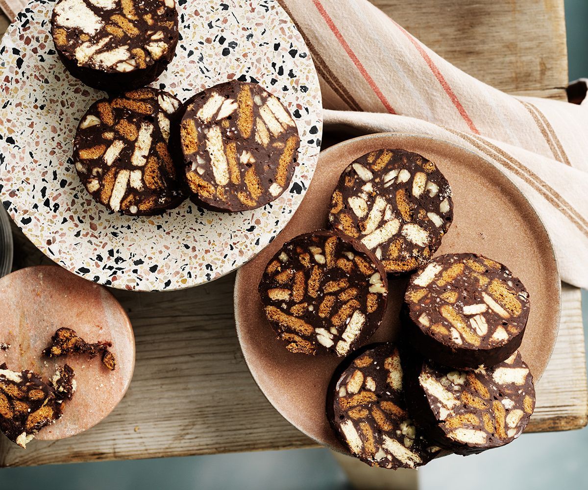 Pour the warm chocolate mixture over the crushed biscuits. Add the chopped nuts (and coconut or dried fruit, if using). Mix well, making sure all the biscuit pieces are coated.Press into the tin